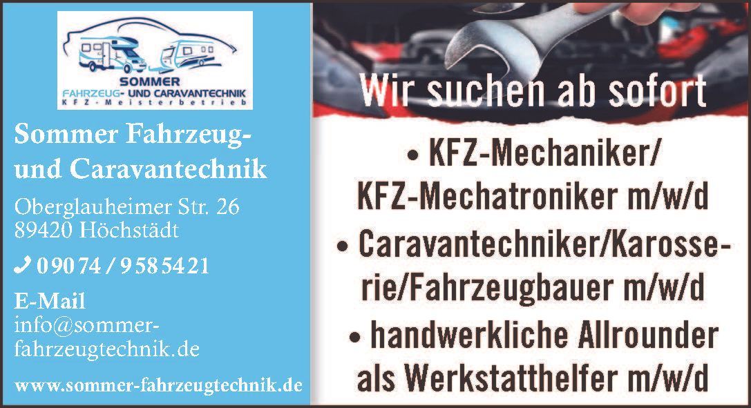 Die Firma Sommer Fahrzeug- und Caravantechnik ist Ihr zuverlässiger Partner für Ihre Anliegen rund ums Camping und Caravaning. Wir legen besonderen Wert auf Ihre Bedürfnisse und richten uns daher immer nach Ihren Wünschen und Anforderungen und führen diese für Sie wie gewünscht aus. Seit 01.10.2022 dürfen wir sie auch in Sachen PKW, Transporter und kleine Nutzfahrzeuge in unserer KFZ-Meisterwerkstatt begrüßen.